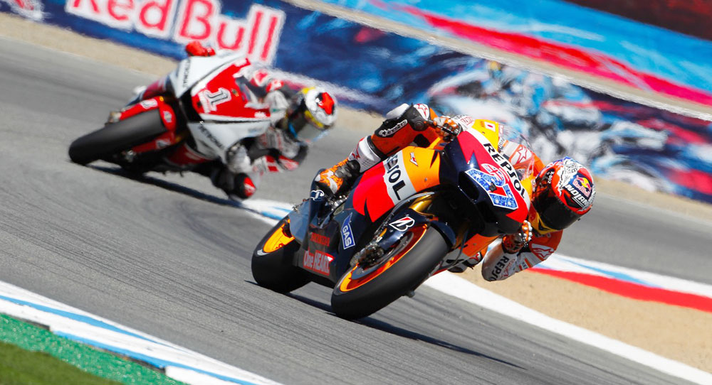 Start utrke u legendarnoj Laguna Seci, bio je sasvim nalik startu utrke u Sachsenringu tjedan dana ranije. I tu je poveo Lorenzo na Yamahi ispred tri tvorničke i jedne privatne Honde u rukama Simoncellija. Sasvim očekivano, Simoncelli na neravnoj i podmukloj stazi nije mogao dugo izdržati i pao je u sedmom krugu, s time da je prije njega pao i Crutchlow, a nešto kasnije i Bautista.