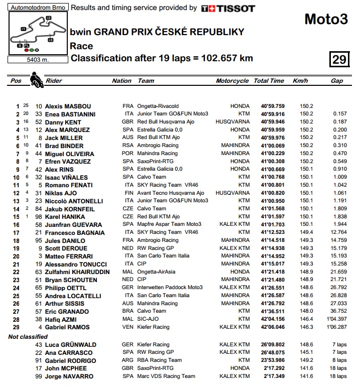 Nesretni Rins je završio kao 9., a o nevjerojatnoj izjednačenosti u Moto3 klasi najbolje govori da je slabo poznati Juanfran Guevara zaostao manje od 2 sekunde za pobjednikom, a svejedno ostao bez bodova jer je ciljem prošao kao tek 16.