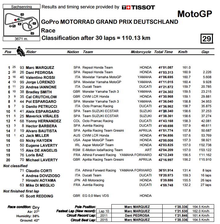 Nakon što je u Assenu prešao na prošlogodišnji okvir i tek nakon sudara s Rossijem u zadnjem zavoju ostao bez pobjede, Marquez je Sachsenringu pokazao da je taj korak natrag značio dva koraka naprijed. Nakon odličnog starta, Lorenzo ga je prestigao u drugom zavoju, ali ovaj put nije uspio pobjeći u svom stilu. Štoviše, Lorenzo je ubrzo svjedočio kako ga obilazi ne samo Marquez, nego ubrzo i Rossi i Pedrosa, nakon čega se pomirio osvajanjem 4. mjesta i prošao ciljem s gotovo 10 sekundi zaostatka za pobjednikom.