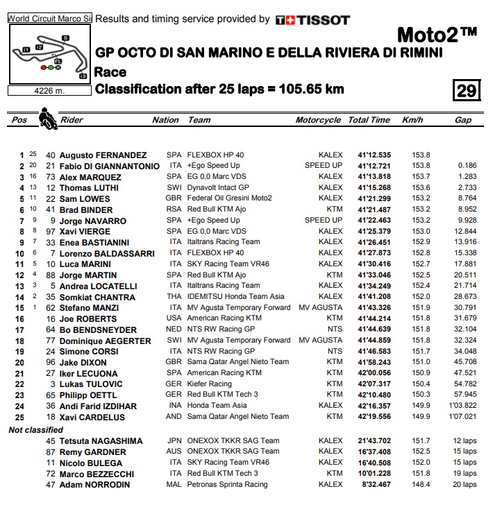 Neki će možda reći da je Marquez malo pretjerao kad se „parkirao“ u zavoju broj 14 ispred Quartararoa, ali tu zapravo nema ništa sporno za razliku od manevra kojim se u istom zavoju pobjede domogao Fernadez u klasi Moto2. I tu je većim djelom utrke vodio rookie, odnosno Di Giannantonio na Speed Upu, da bi ga u završnici posljednjeg kruga napao Fernandez koji je prvo otišao van gabarita staze i tako prenio više brzine na putu do zavoja 14. Tu se onda doslovno progurao ispod Di Giannantonia, pri čemu je prvo došlo do kontakta, a onda je još Španjolac zablokirao Talijana na izlazu. Iako se taj njegov potez neko vrijeme analizirao, Fernandezu je ipak priznata treća pobjeda ove sezone. Alex Marquez je prošao ciljem kao treći na stazi koja mu uopće ne odgovara, što je odlika šampiona, problem za njega je samo u tome što se prednost u odnosu na sve boljeg i agresivnijeg Fernandeza istopila na 26 boda.