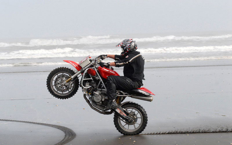 Dok je kod nas na plažama sunčano, na Novom Zelandu je tmurno, zimsko, hladno i maglovito vrijeme. Vlažni tvrdi pjesak se pokazao kao odlična podloga za Stevea Haldanea kako bi iskušao što može njegov terenski Ducati. Ne, nije riječ o izvedenici iz Multistrade već je ovaj motocikl život započeo kao Ducati 999, a Steve ga je „doradio" kako bi mogao juriti pješčanim plažama.