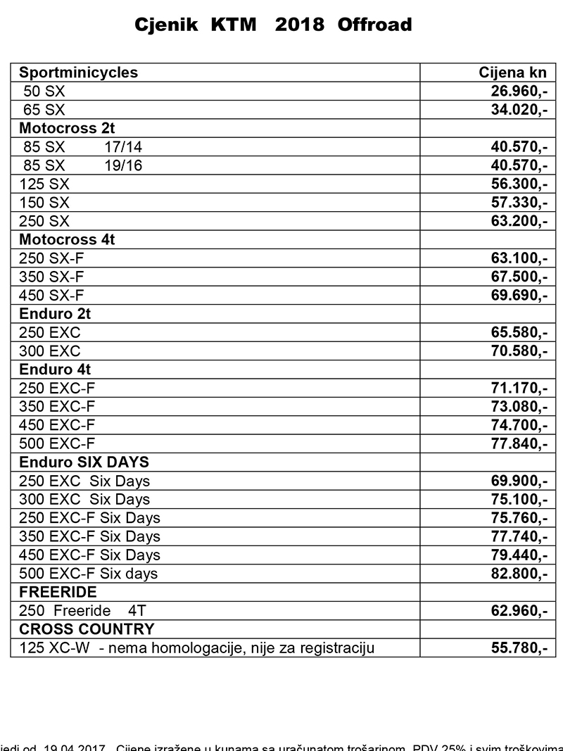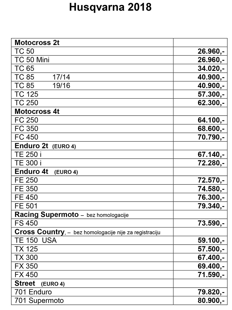 Poznate su cijene svih off road modela 2018. KTM i Husqvarne, a upravo ih je objavio uvoznik za Hrvatsku Moto Špica iz Varaždina.